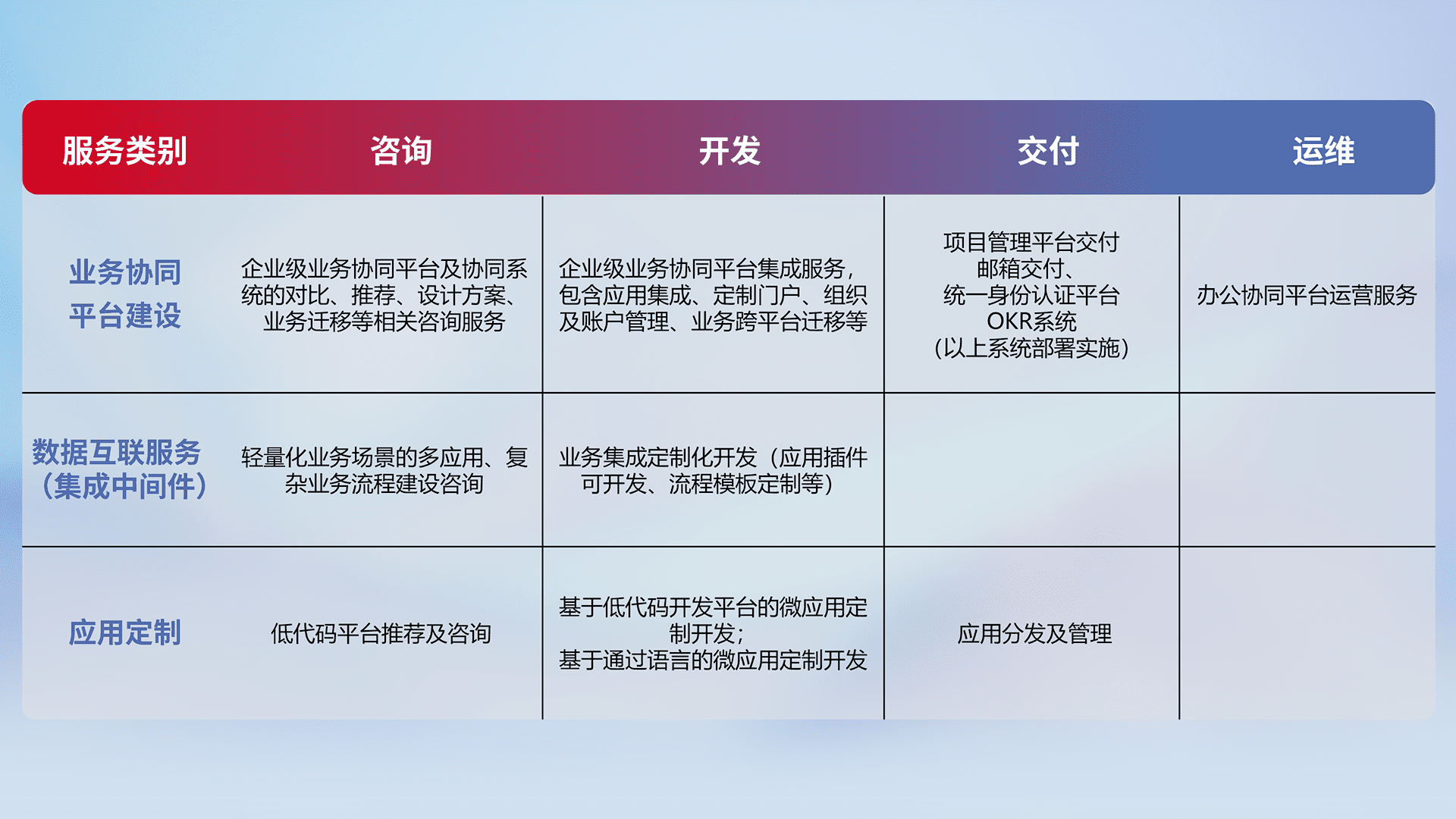 针对钉钉、、企微、、、IDaas等平台级产品提供产品的规划、、、方案、、、交付、、、定制化开发等服务,,,,实现如统一协同办公、、、、智能客户服务、、、、混合会议管理、、、、智能数据查询、、、等业务场景,,,,实现数字化转型。。