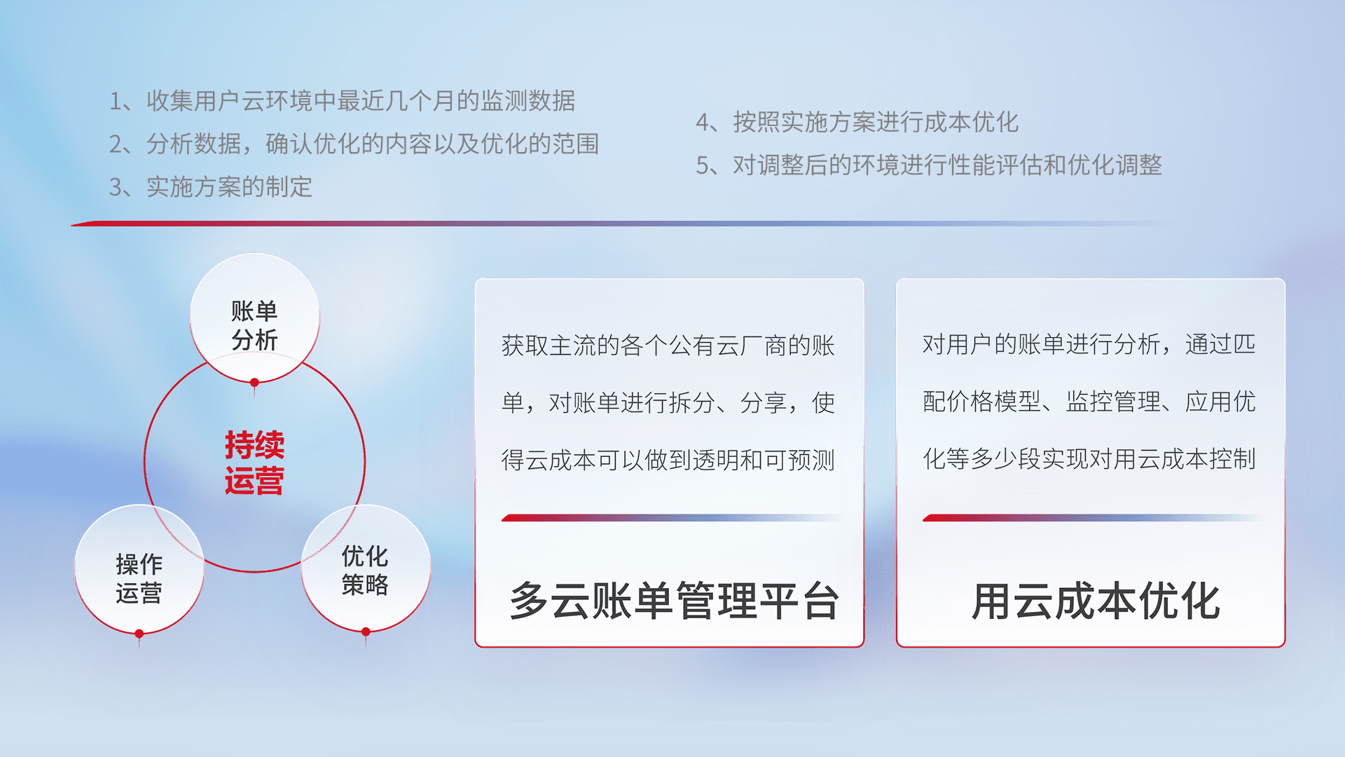 通过多云纳管,,,以统一的资源数据模型把客户的云资源进行抽象和封装,,,进而实现对多云资源的统一操作,,,,保障云资源管理的可靠性、、稳定性与可用性。。。量身定制化运维内容,,配置、、、开发运维、、补丁管理、、、备份、、、、监控、、、、认证和访问管理、、、审计和日常巡检等,,,保障在用云过程中的可靠度,,,,稳定度以及高可用率。。